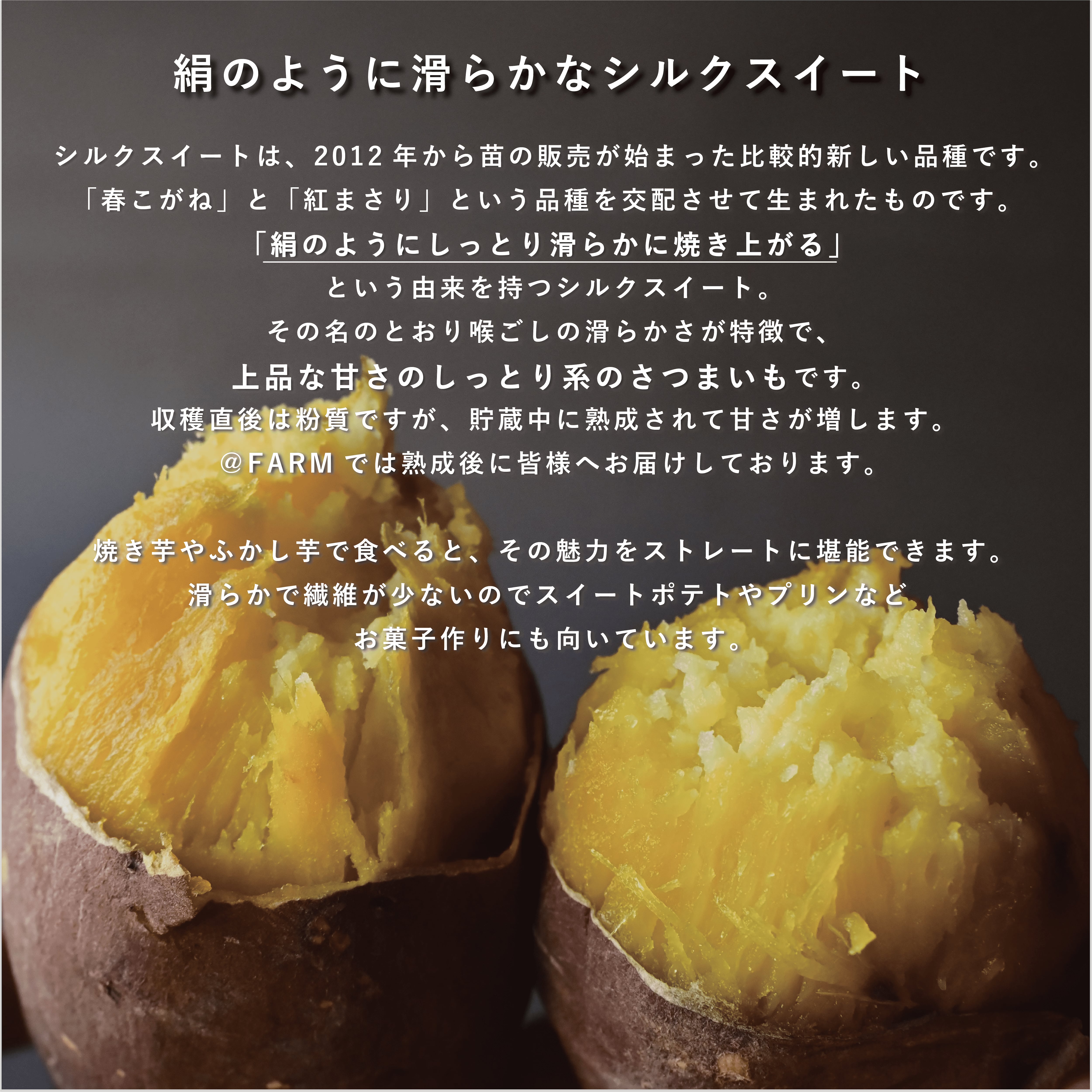 シルクスイートの特徴はなんと言っても絹のようにしっとり滑らかとした食感です。焼き芋にしていただくとさらに甘みが増します。最近人気なしっとり系のさつまいもはいかがでしょうか?